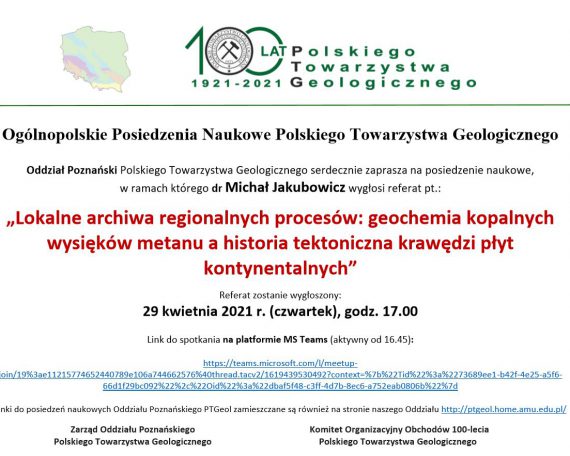 Oddział Górnośląski Polskiego Towarzystwa Geologicznego zaprasza na referat: mgr Anny Abramowicz (INoZ UŚ), dr hab. Justyny Ciesielczuk, prof. UŚ, dr hab. Magdaleny Misz-Kennan, prof. UŚ i prof. Moniki Fabiańskej pt.: „Czasowo-przestrzenna charakterystyka pożaru zwałowisk odpadów po eksploatacji węgla kamiennego” Referat zostanie wygłoszony: 6 maja 2021r. (czwartek, godz. 17.00) Link do spotkania na platformie MS Teams (aktywny od 16.45): https://teams.microsoft.com/l/meetup-join/19%3ameeting_YzMyZjcyYzYtMGM3OS00OTBjLWIxOWYtZDgyZTY2MmUxNjk5%40thread.v2/0?context=%7b%22Tid%22%3a%2250c76291-0c80-4444-a2fb-4f8ab168c311%22%2c%22Oid%22%3a%22d2599996-7fcb-4b13-87e0-6b84474d4fe6%22%7d Zarząd Oddziału Górnośląskiego PTGKomitet Organizacyjny Obchodów 100-lecia PTG