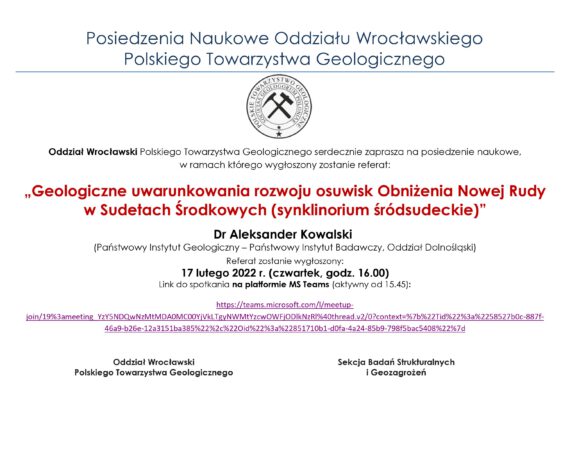 Oddział Wrocławski Polskiego Towarzystwa Geologicznego serdecznie zaprasza na posiedzenie naukowe, w ramach którego wygłoszony zostanie referat: Geologiczne uwarunkowania rozwoju osuwisk Obniżenia Nowej Rudy w Sudetach Środkowych (synklinorium śródsudeckie) dr Aleksander Kowalski (PIG-PIB, Oddział Dolnośląski) https://teams.microsoft.com/l/meetup-join/19%3ameeting_YzY5NDQwNzMtMDA0MC00YjVkLTgyNWMtYzcwOWFjODlkNzRl%40thread.v2/0?context=%7b%22Tid%22%3a%2258527b0c-887f-46a9-b26e-12a3151ba385%22%2c%22Oid%22%3a%22851710b1-d0fa-4a24-85b9-798f5bac5408%22%7d Referat zostanie wygłoszony 17 lutego 2022 r. (czwartek, godz. 16.00) Oddział Wrocławski Polskiego Towarzystwa Geologicznego Sekcja Badań Strukturalnych i Geozagrożeń PTGeol